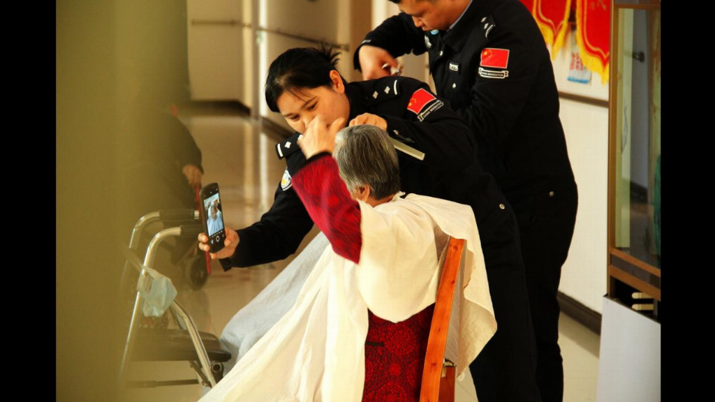 活动室的另一角,剪子的咔擦声清脆地响着。朱停停扶着一位奶奶稳稳坐下,为她系好围布。她的动作很轻,左手掌心虚托着老人的鬓角,右手持剪刀顺着鬓角缓缓下行。花白的发茬簌簌落下,露出老人清癯的轮廓。“年轻时,我也是这么给我爷爷理发的。”老人眯着眼,声音里有一种遥远的温柔。她没有说话,只是更慢了些,指腹时不时轻触老人的头皮,感受着温度与岁月在这里留下的痕迹。镜子前,她微微侧身,仔细修整着耳后的发角,神情专注得像是完成一件重要的仪式。理完发,她蹲下身,用软刷轻轻扫去老人颈间的碎发。老人抬手摸了摸平整的鬓角,眼里映着窗上的新窗花,也映着她含笑的脸。