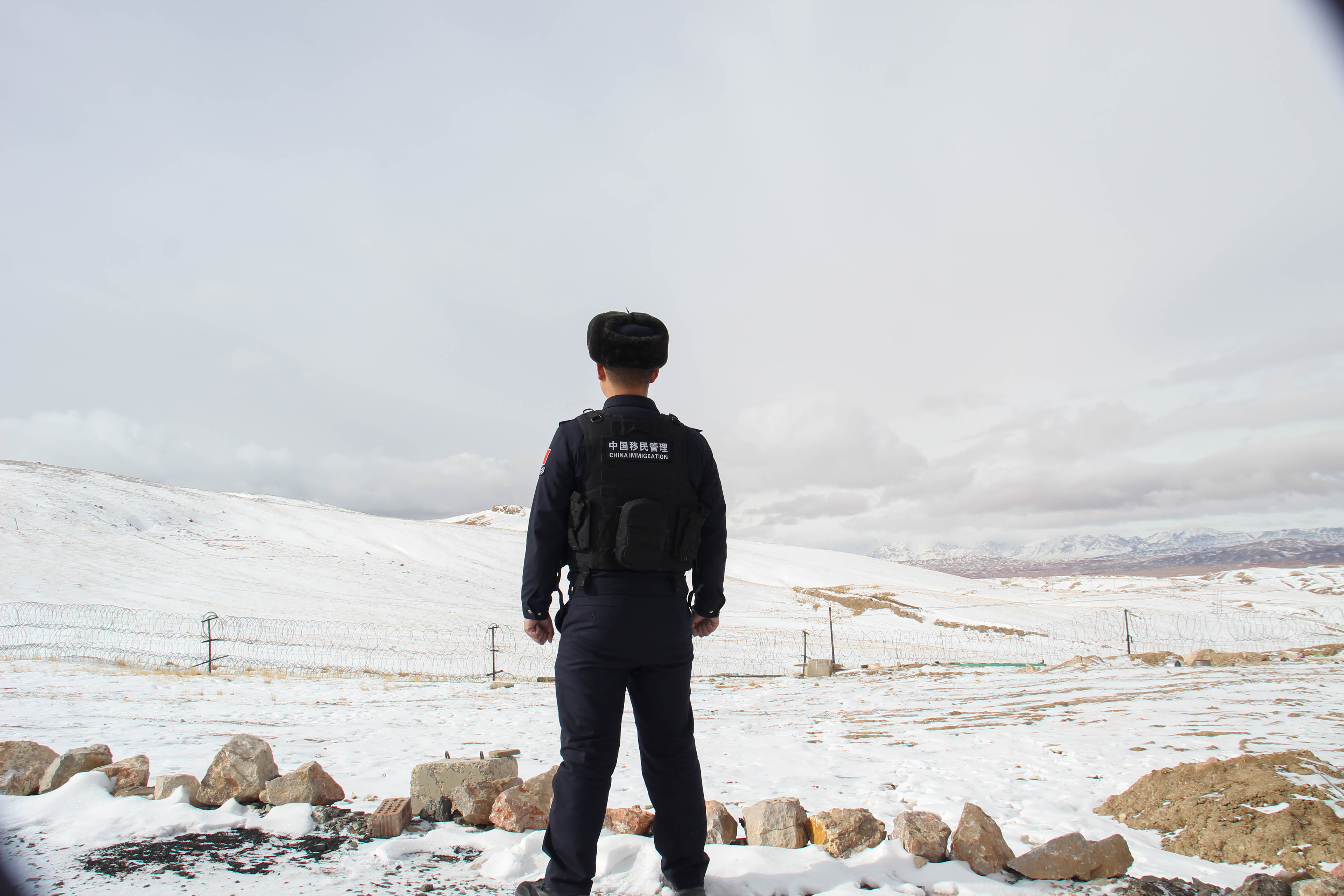 图2为休息间隙,年轻的民警望着远处的雪山思念家乡与亲人
